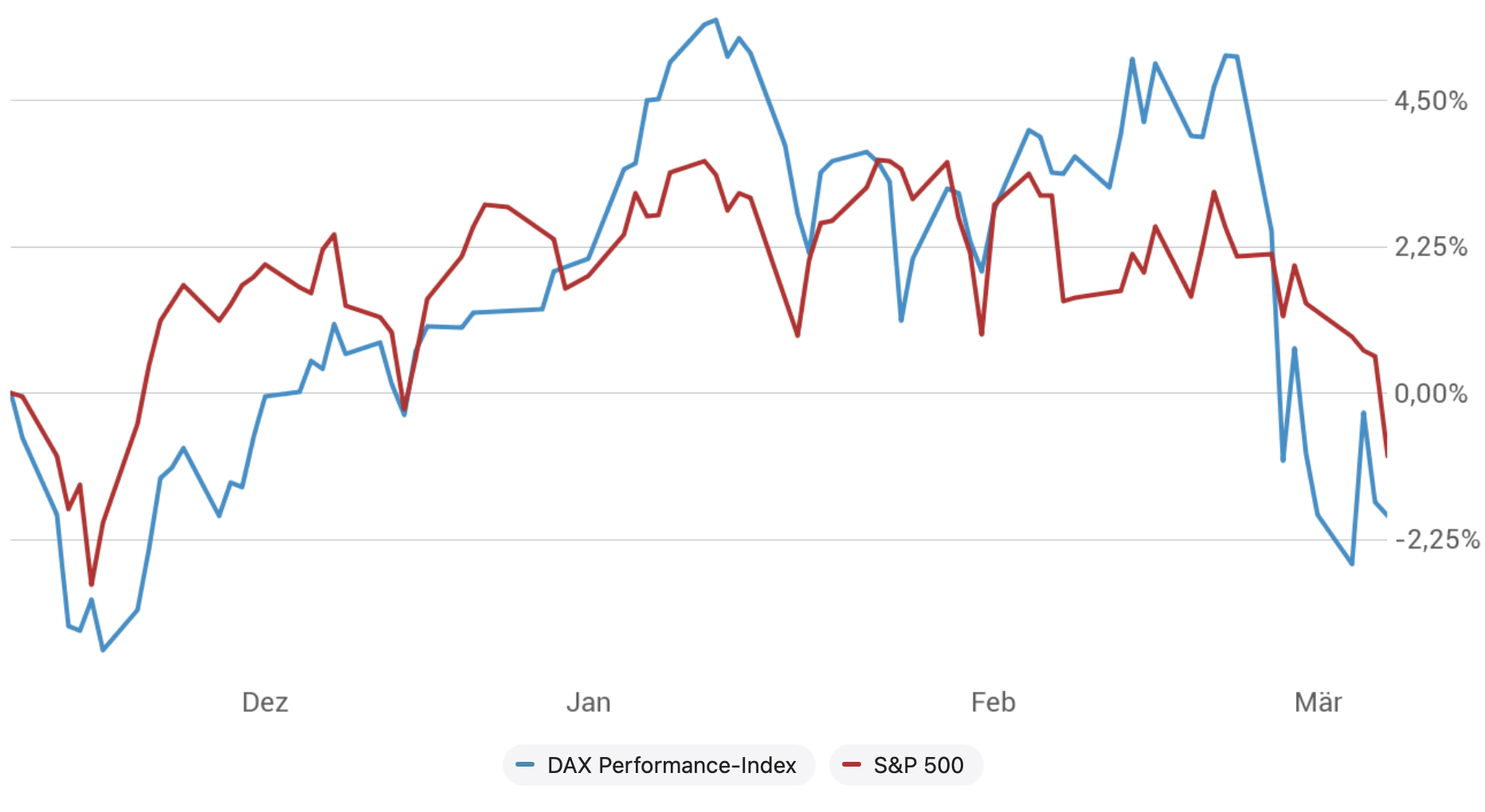 Ich habe es diese Woche im Marktkompass am Mittwoch aufgegriffen: Der DAX leidet doppelt so stark unter dem Energiepreisschock durch den Iran-Krieg wie die US-Indizes. Konkret hat das deutsche Börsenbarometer 2.500 Punkte oder 10% in der Spitze eingebüßt wobei sich der S&P500 mit 5% Abschlag vom Top begnügte. Im Chartvergleich sieht das so aus: