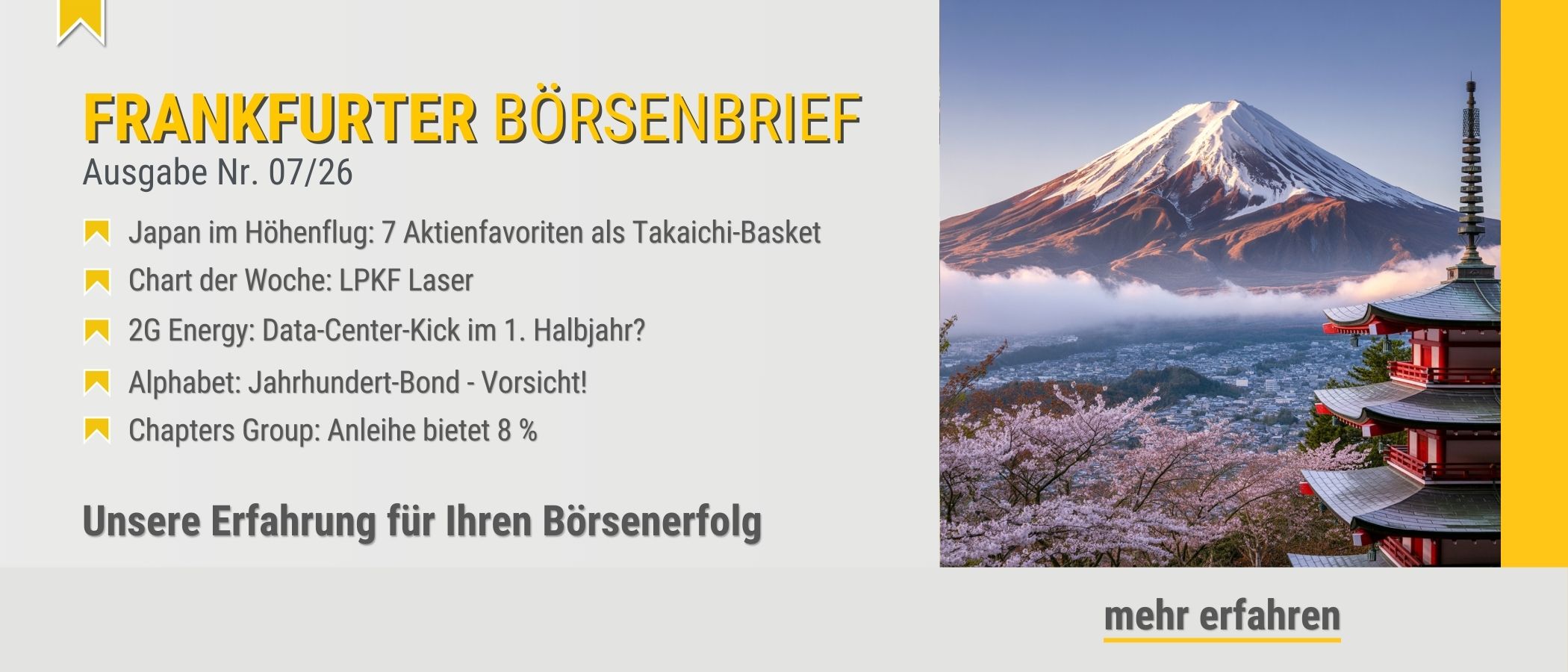<p>Japan steht vor einer neuen, politisch gestützten Wachstumsphase. Mit der klaren parlamentarischen Mehrheit der regierenden LDP unter Premierministerin Takaichi verfügt die Regierung über volle Kontrolle des legislativen Prozesses. Das erinnert an die frühen Jahre der Koizumi- und Abe-Administrationen und schafft die Grundlage für eine wirtschaftspolitische Agenda aus moderater fiskalischer Expansion, Investitionen in Schlüsselindustrien und anhaltendem Abwärtsdruck auf den Yen. </p> <p>Zwar ist die Bewertung des japanischen Aktienmarkts inzwischen anspruchsvoller geworden, mit einem Forward-KGV des Topix von rund 17. Dennoch bleibt die relative Attraktivität hoch, zumal ausländische Investoren zurückkehren: Seit Beginn der Takaichi-Administration wurden netto rund 5,2 Billionen Yen in japanische Aktien investiert. Hier zeichnen sich Parallelen zum Start der Abenomics ab, als massive Kapitalzuflüsse eine mehrjährige Neubewertung des Marktes auslösten. </p> <p>Besonders profitieren dürften vier Sektoren. Erstens der Bankensektor, der Rückenwind durch steigende Unternehmensinvestitionen, höhere Kreditnachfrage und umfangreiche Aktienrückkäufe erhält. Als Kerninvestment gilt hier die Mitsubishi UFJ Financial Group, die von steigenden Margen, Kapitaldisziplin und attraktiven Ausschüttungen profitiert.</p> <p>Zweitens rückt der Verteidigungssektor in den Fokus. Japan strebt an, die Verteidigungsausgaben bis 2030 auf bis zu 3,5 % des BIP zu erhöhen. Ab dem Fiskaljahr 2027 werden die Ausgaben laut Schätzungen jährlich um rund 2,2 Billionen Yen (rd. 11,9 Mrd. €) steigen. Damit steht der japanische Aerospace- und Defence-Sektor vor einem mehrjährigen strukturellen Nachfragezyklus. Besonders aussichtsreich sind drei Standardwerte: Mitsubishi Heavy Industries, das eine Schlüsselrolle in Rüstung, Raumfahrt und Energie spielt, IHI Corporation mit Fokus auf Triebwerke und militärische Anwendungen sowie Kawasaki Heavy Industries, das breit diversifiziert im Verteidigungs- und Industriebereich aufgestellt ist.<br />Drittens profitieren japanische Unternehmen zunehmend vom Investitionsboom in den USA. Die wirtschaftliche Abhängigkeit von China nimmt ab, während die Verflechtung mit den Vereinigten Staaten zunimmt. Im Rahmen der jüngsten Handels- und Investitionsabkommen wurden japanische Direktinvestitionen von rund 550 Mrd. $ in den USA zugesagt. Davon profitieren insbesondere zyklische Industrieunternehmen mit starker US-Präsenz. Ein zentraler Profiteur ist Komatsu, das direkt vom US-Infrastruktur- und Industriebau profitiert und trotz normalisierter Gewinne weiterhin moderat bewertet ist.</p> <p>Viertens setzt die Regierung gezielt auf strategische Zukunftsindustrien. Neben Verteidigung zählen dazu Halbleiter und KI, Nukleartechnik, Schiffbau, Luft- und Raumfahrt, Biotechnologie sowie Cybersecurity. Hier verbindet Japan technologische Tiefe mit politischer Unterstützung. Besonders hervorzuheben sind Hitachi, das von Digitalisierung, Energie- und Infrastrukturinvestitionen profitiert, sowie Advantest, ein zentraler Zulieferer der globalen Halbleiterindustrie und direkter Profiteur steigender Investitionen in KI- und Chipkapazitäten.</p> <p>In der Summe ist das skizzierte „Takaichi-Basket“ aus sieben Basiswerten keine kurzfristige Wahlwette sondern ist als Baisinvest für eine mehrjährige Industriestrategie in Japan zu sehen. Trotz gestiegener Bewertungen bleibt Japan für internationale Investoren attraktiv, insbesondere bei selektiver Fokussierung auf die zuvor genannten Branchen. Da die Kurse teils bereits gut gelaufen sind, empfiehlt sich bei den sieben Kerninvestments die übliche Konsolidierung um 5 - 10 % abzuwarten. </p> <p><img src="https://bernecker.info/images_external/Horntrich Charts/takaichi basket.JPG" alt="" width="350" height="192" /></p>