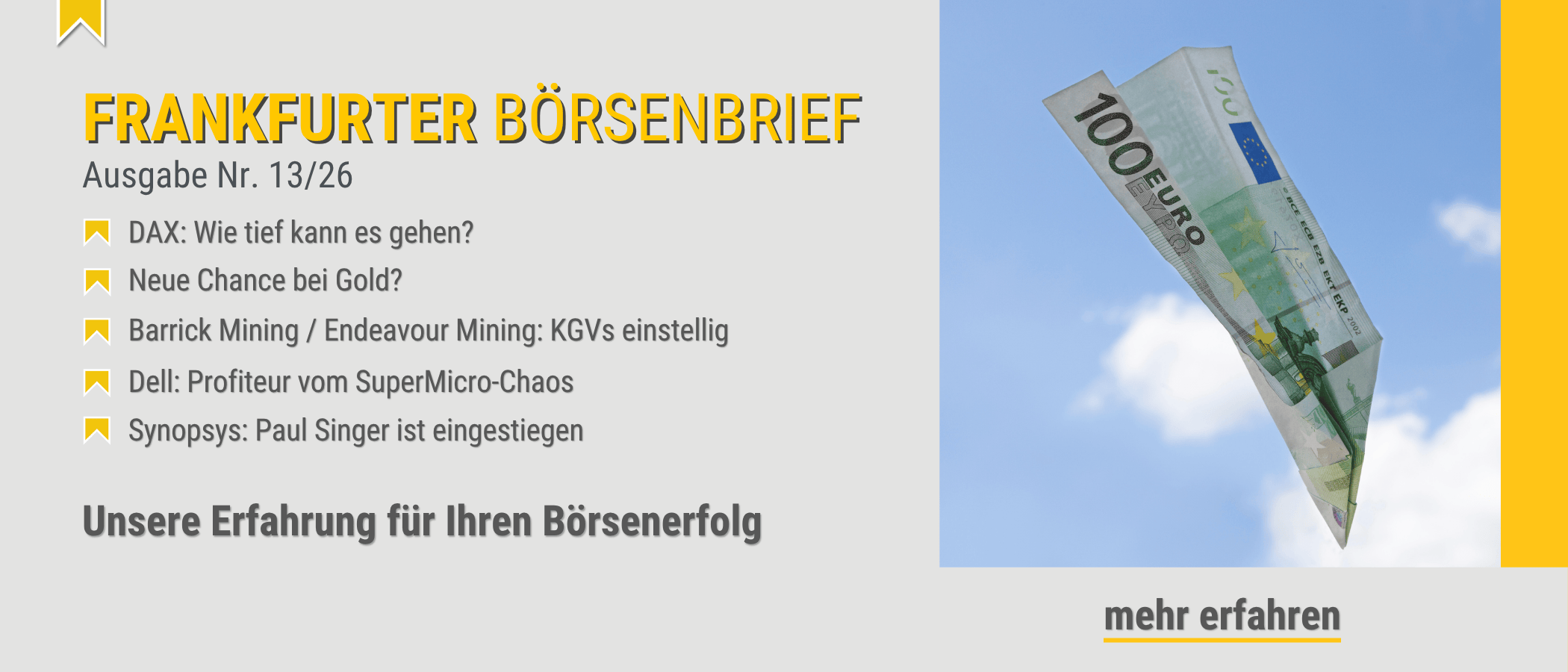 Unser Börsenbrief-Finder hilft Ihnen, schnell und einfach den passenden Börsenbrief zu finden. Nach nur wenigen Fragen erhalten Sie 2 bis 3 Vorschläge, sofort und ohne Registrierung. Viel Spaß mit unserem Börsenbrief-Finder!