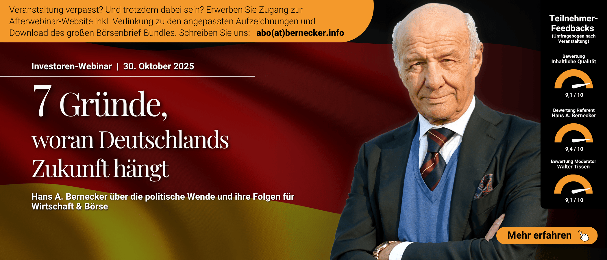 <h2><strong>Ihr Kompass für das Börsenjahr 2026: Der neue Bernecker Wegweiser für Kapitalanlagen 2026</strong></h2> <p><a title="Infoseite Bernecker Wegweiser für Kapitalanlagen 2026" href="https://ichkaufeaktien.de/wegweiser-2026/" target="_blank" rel="noopener"><img src="https://www.bernecker.info/images_external/Wegweiser/WW25 Mailversand.png" alt="" width="800" height="342" /></a></p> <p> </p> <p><strong>Jetzt Vorbestellpreis sichern – Zukunftstrends früh erkennen</strong></p> <p>Rauszoomen aus dem Tagesgeschäft und Orientierung finden für die großen Trends. Gewinnchancen identifizieren, bevor es die breite Masse tut. Nutzen Sie dafür die umfangreiche Erfahrung im "Bernecker Wegweiser für Kapitalanlagen 2026". Unter den Autoren: Börsen-Altmeister Hans A. Bernecker, Bernecker-Redaktionsleiter Volker Schulz, Markus Horntrich, Oliver Kantimm und weitere mehr. Unter den Schlaglichtern:</p> <ul> <li><strong>Humanoide Roboter </strong>- Die Dynamik und der technologische Fortschritt haben sich massiv beschleunigt - humanoide Roboter in der Industrie und als fleißige Helfer im täglichen Leben gelten als potenzieller Megamarkt der nächsten Jahre. Wer sind die größten Profiteure?<br /><br /></li> <li><strong>Organoide</strong> - Mini-Organe aus Stammzellen haben das Zeug dazu, Medizin und Arzneimittelforschung zu revolutionieren. Welche Perspektiven ergeben sich daraus und welche Unternehmen sind die Profiteure?<br /><br /></li> <li><strong>Gold-Rally ohne Ende </strong>- Warum das Edelmetall noch immer zu günstig ist und auch Kurse von 6.000 oder 8.000 Dollar je Unze realistisch sind. Wie positioniert man sich optimal im laufenden Gold-Bullenmarkt, bleiben Produzenten im Fokus oder ist das Direktinvestment zu bevorzugen?<br /><br /></li> <li><strong>Kryptowährungen </strong>- sind längst mehr als ein Spielplatz für Spekulanten. Wer klare Regeln beachtet und systematisch vorgeht, kann die Chancen der digitalen Anlagewelt nutzen, ohne im Chaos von Hype und Crash unterzugehen.<br /><br /></li> <li><strong>Licht statt Kupfer </strong>- Optische Halbleiter - die kommende Revolution im Datacenter. Der Flaschenhals der KI Rechenzentren liegt nicht nur in den GPUs, sondern im Datentransport zwischen ihnen. Die Antwort heißt Licht. Optische Halbleiter übernehmen Erzeugung, Führung, Modulation und Messung der Signale. Das sind die Favoriten!<br /><br /></li> <li><strong>Einkommensstrategien mit Optionen </strong>- Durch Covered Calls oder Cash Secured Puts können Anleger regelmäßige Zusatzerträge auf Aktien generieren und ihr Portfolio robuster machen.<br /><br /></li> <li><strong>Es gibt noch so viel mehr zu entdecken</strong> - und strategisch zu nutzen. Dies nur ein kleiner Vorgeschmack auf die breite Themenwahl, die Sie erwartet. </li> </ul> <p><strong>Wichtig:</strong> Nutzen Sie den günstigeren Vorbestellpreis, um sich vorab schon mal Ihr Exemplar zu sichern. Der Preisrabatt gilt bis 16.11.2025. Also am besten gleich zuschlagen und noch heute vorbestellen. Die Auslieferung erfolgt dann voraussichtlich gegen Anfang Dezember. </p> <h3><strong>Mehr erfahren, Video ansehen & in kostenlose Leseproben hineinschnuppern auf unserer Website:</strong><br /><a href="https://ichkaufeaktien.de/wegweiser-2026/" target="_blank" rel="noopener"><strong>www.ichkaufeaktien.de/wegweiser-2026</strong></a></h3> <p>P.S.: Der Wegweiser für Kapitalanlagen eignet sich auch als Geschenk für jemandem, dem Sie breite Markterfahrung an die Hand geben wollen.</p>