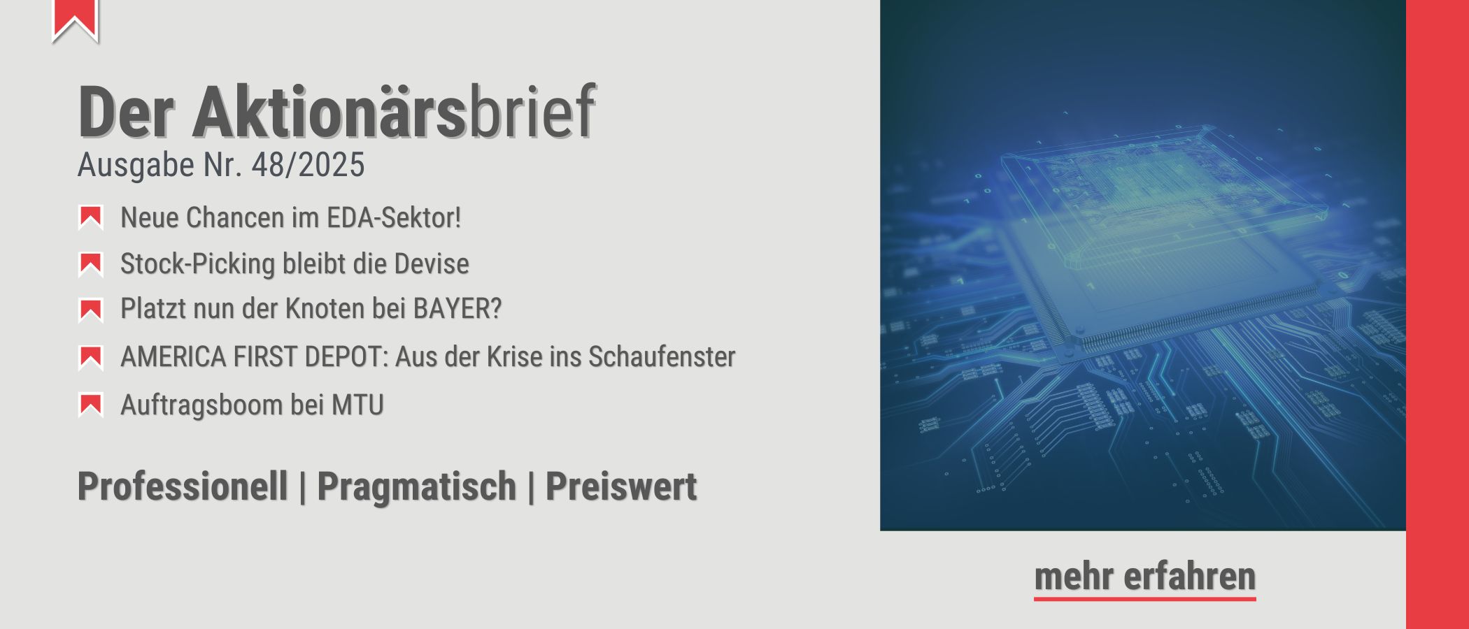 <p><strong>Der DAX wirkt angeschlagen.</strong> Andererseits sind wir gerade in einer saisonal besonders günstigen Etappe des Börsenjahres. Was passiert beim DAX, wenn sich ein politischer Wechsel konkretisiert? Oder in der Ukraine endlich die Waffen zum Schweigen gebracht werden können? Wird an der Wall Street noch weiter Luft aus der KI-Aktienwelt abgelassen? Droht sogar ein finanzieller Unfall? In dieser besonders spannenden Zeit lassen Sie sich bitte noch enger am Puls der Märkte durch das Geschehen begleiten. Das Instrument dafür heißt: <strong>Bernecker Daily</strong>. Diesen Brief gibt es in aktuell in der <strong>BERNECKER BLACK WEEK</strong> mit einem kräftigen Rabatt. Der Aktionszeitraum gilt befristet bis zum 30.11.2025. Viele Jahrzehnte an Börsenerfahrung für Ihr Depot - vom Team um Hans A. Bernecker – und das aktuell zum Sparpreis. Bitte kurzfristig zuschlagen:</p> <p><a href="https://bernecker.info/black-week"><strong>www.bernecker.info/black-week</strong></a></p>