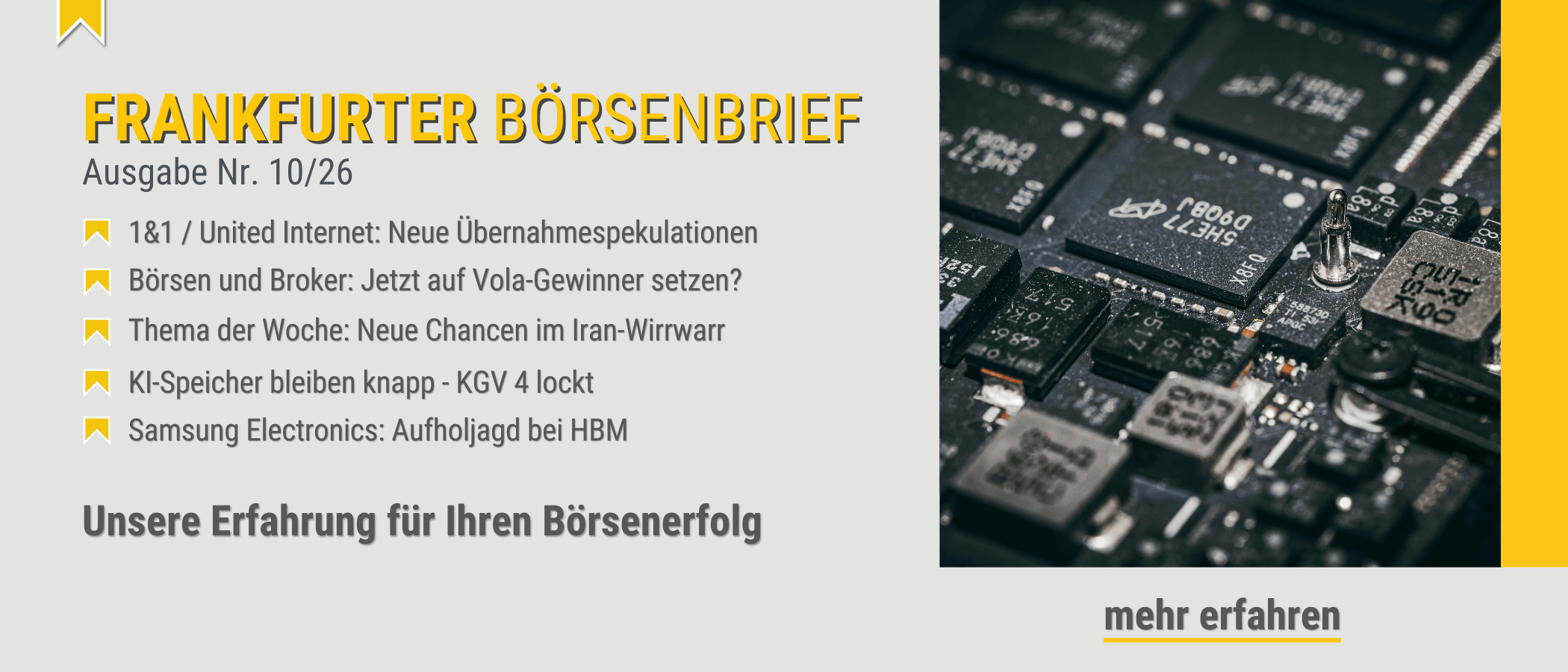 <p>Im Zuge des Irankrieges gibt es Aktien wieder auf Niveaus, die man vor wenigen Tagen noch als lukrativ erachtet hätte. Insgesamt steht derzeit vor allem die koreanische Börse stark unter Druck, was bei Qualitätstiteln wie SK Hynix, Samsung Electronics oder Hyundai Motors zu deutlichen Kursverlusten führte.</p> <p>Der starke Rückgang des KOSPI hat aktuell mehrere Ursachen, die vor allem mit der geopolitischen Eskalation im Nahen Osten und der Struktur der koreanischen Wirtschaft zusammenhängen. Südkorea ist ein extrem energieabhängiges Importland und bezieht rund 70 % seines Öls aus dem Nahen Osten. Steigende Ölpreise und Risiken für die Straße von Hormus treffen daher die koreanische Wirtschaft besonders stark. Durch die Schwäche des Südkoreanischen Won ziehen internationale Investoren in Phasen, wie wir sie aktuell sehen, Kapital ab. Nach einer extremen Rally in den vergangenen Monaten sind Gewinnmitnahmen in einer solchen Phase auch nachvollziehbar. </p> <p><strong>KI-Speicher bleiben knapp - KGV 4 lockt</strong></p> <p>Der Irankonflikt ist endlich, was im Umkehrschluss auch neue Chancen eröffnet. Eine dieser Chancen sehen wir in SK Hynix. Mit einem geschätzten Marktanteil von aktuell etwa 40 % sind die Koreaner der führende Player im Speichermarkt, insbesondere im für KI wichtigen Bereich High Bandwidth Memory (HBM). Erzrivale Micron Technology kommt auf rd. 21 % Marktanteil. Ab diesem Jahr läuft der Roll-out der HBM4-Chips, die in Nvidias Top-GPU-/AI-Chip-Architektur zum Einsatz kommen. Das Thema hatten wir seit FB 38/2025 regelmäßig beleuchtet.</p> <p>Die Dynamik im aktuellen Speicherzyklus ist ungebrochen. Nach jüngsten Brancheninformationen werden die Preise erneut angehoben, im Einzelnen wie folgt: Für das erste Quartal 2026 wird DDR-DRAM nun um + 72 % teurer als im Vorquartal und in Q2 schätzungsweise um 40 %, NAND-Speicher liegen bei + 65 % in Q1 bzw. + 30 % in Q2. Server-DDR5 werden auf rd. 1 $ pro Gigabit (Gb) taxiert und für Q2 um weitere 30 bis 50 % höher erwartet. NAND dürfte im Quartal um weitere 30 % QoQ zulegen. Diese Wachstumsraten bei den Preisen untermauern den Engpass durch die massive KI-Nachfrage.</p> <p>Die HBM-Endnachfrage 2026 wird auf 31,1 Mrd. Gigabit steigen, was einem Plus von 80 % im Jahresvergleich entspricht. 2027 sollten es 53,9 Mrd. Gigabit (+ 73 %) werden, getrieben durch höhere Beschaffungen von KI-GPUs, was auf eine Auslieferung von mehr als 60 Mrd. Gigabit in 2027 hinausläuft. SK Hynix dürfte 2027 auf rund 45 % Marktanteil kommen und ist damit größter Profiteur dieser Entwicklung. Die akute Unterversorgung ist nicht zeitnah zu bereinigen. Der Ausbau von Wafer-Kapazitäten ist durch Reinraumflächen, längere Equipment-Lieferzeiten und qualifizierte Installationskapazitäten limitiert. In der Industrie wird mit einem Angebotsdefizit bis ins Jahr 2028 gerechnet.</p> <p>Der Margenhebel bei den HBM-Herstellern bleibt bestehen. Daran ändert auch der Irankonflikt nichts, sondern belastet allenfalls das kurzfristige Sentiment. SK Hynix wird aktuell mit einem KGV für das laufende Jahr von lediglich 5 bewertet, was nach der Rally der zurückliegenden Monate beeindruckend ist. Für 2027 kommt der Speichergigant sogar auf nur 4. Den Rücksetzer um rd. 25 % nutzen wir im spekulativen Musterdepot für eine erste Position. (MH)</p> <p>Samsung ist die Nr. 2</p> <p>Die Schlussfolgerungen hinsichtlich Preis- und Margenentwicklung betreffen auch Samsung Electronics. Ein nicht zu vernachlässigender Teil der erhöhten Kapazitätsauslieferungen für 2027 kommt durch den schnelleren Hochlauf bei HBM-Umfängen bei Samsung zustande. Die UBS hat ihre Schätzung für Samsung für das Jahr 2027 zuletzt von zuvor 15,0 Mrd. auf 20,0 Mrd. Gigabit erhöht. Darin spiegelt sich die schneller als erwartete Hochlaufphase der DRAM-Kapazität im Werk Pyeongtaek P4 wider, wo die installierte Waferkapazität bis Ende 2026 bei 105.000 Wafer pro Monat erwartet wird, nach 20.000 per Ende 2025. In der Folge wird Samsung im Jahr 2027 mit einem HBM-Marktanteil von 34 % die Nummer 2 hinter SK Hynix sein, noch vor Micron Technology mit ca. 20 %.</p> <p>Ergänzend zur erfolgreichen Aufholjagd bei KI-Speicherchips ist das boomende Foundry- und Systemhalbleitergeschäft ebenfalls zu berücksichtigen. Die Fähigkeiten bei 3- und 2-Nanometer-Fertigungsprozessen schaffen Synergien mit dem Speicherchipgeschäft. Darüber hinaus generiert das Geschäft mit KI-fähigen Endgeräten (Haushaltsgeräte, Smartphones, Wearables) Wachstum.<br />Samsung Electronics kommt hinsichtlich Bewertung nach aktuell ebenfalls rd. 25 % Korrektur auf ein 2026er-KGV von 7,5 und 6,4 auf Basis der Schätzung für 2027. Das ist zu günstig, auch unter Berücksichtigung etwaiger Erwartungskorrekturen. Diese hängen von der Dauer der Kriegshandlungen im Iran ab - je kürzer, desto unwahrscheinlicher wird ein etwaiger Korrekturbedarf. (MH)</p> <p>Hyundai Motor: Ausnahmeerscheinung</p> <p>Eine Alternative außerhalb des Technologiesektors ist Hyundai Motor, die insgesamt im Autosektor eine Ausnahmeerscheinung ist. Während Vertreter wie VW, BMW oder Mercedes kurstechnisch kaum auf die Beine kommen, schaffte Hyundai Motor auf Jahressicht ein Plus von 150 % auf Euro-Basis. Das liegt im Wesentlichen an der ausgewogenen Produktpolitik inklusive Elektrifizierung, aber auch zu weiten Teilen am Umstand, dass die Südkoreaner nicht direkt am Gängelband der EU hängen. Der nächste Investitionsschwerpunkt steht ebenfalls: Hyundai Motor plant Investitionen von umgerechnet rd. 6,3 Mrd. $ zum Ausbau von Künstlicher Intelligenz, Robotik und Wasserstofftechnologie.<br />Trotz der guten Entwicklung ist die Aktie noch günstig. Das 2027er-KGV beläuft sich auf 10. Der Wert hat vom letzten Hoch ebenfalls gut ein Viertel verloren und bietet nun die Chance zum Positionsaufbau, Brokerzugang Börse Seoul vorausgesetzt, da die Aktie in Deutschland nicht gehandelt wird. </p>