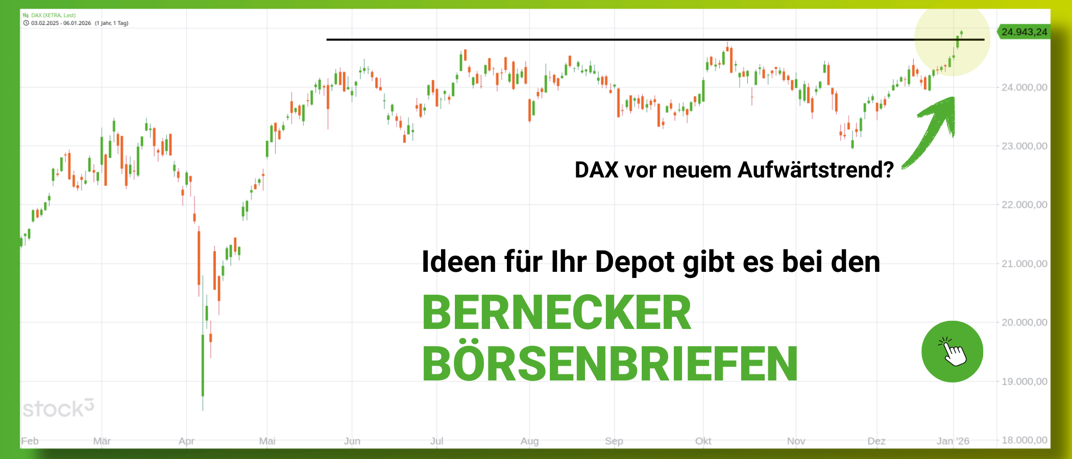 <p>Die Wall Street tendierte gestern freundlich, zwei Segmente stachen hervor. Der Rohstoffsektor und Unternehmen mit Preissetzungsmacht konnten zulegen. Zu den ersteren gehören etwa die Mienen und zur zweiten Gruppe zum Beispiel Chip-Maschinenbauer. Unterm Strich führten gestern wieder der DOW JONES und der RUSSELL2000 mit Zugewinnen zwischen 1,2 % und 1,5 % die Szenerie an. S&P500 und NASDAQ schaffen +0,6%. Der Fear & Greed Index notiert mit 52 im neutralen Bereich, der VIX unter 15 zeigt geringe Volatilität an.</p> <p>Der DAX ist der 25.000 Punkte Marke gestern in der Nachbörse schon auf die Pelle gerückt. Kurz nach der Eröffnung heute Vormittag war es dann so weit: das deutsche Börsenbarometer hat die runde Marke gekcknackt. Adidas tanzt allerdings aus der Reihe, lesen Sie hier <a href="https://www.finanzen100.de/premium/bernecker-boersenkompass/marktkompass-dax-24-950-am-allzeithoch-adidas-mercadolibre-asml_H2082905001_6799282/">weiter...</a></p> <p>Das war ein Auszug aus dem Bernecker Börsenkompass bei unserem Partner Finanzen100. Einen vollständigen Überblick können Sie sich in unserer <a href="https://www.finanzen100.de/premium/bernecker-boersenkompass/analysen/">Artikelübersicht</a> verschaffen. Wenn Sie unsere Inhalte interessant finden und mehr davon lesen möchten, können Sie uns einen Monat lang gratis testen. Probieren Sie es kostenlos aus!</p>