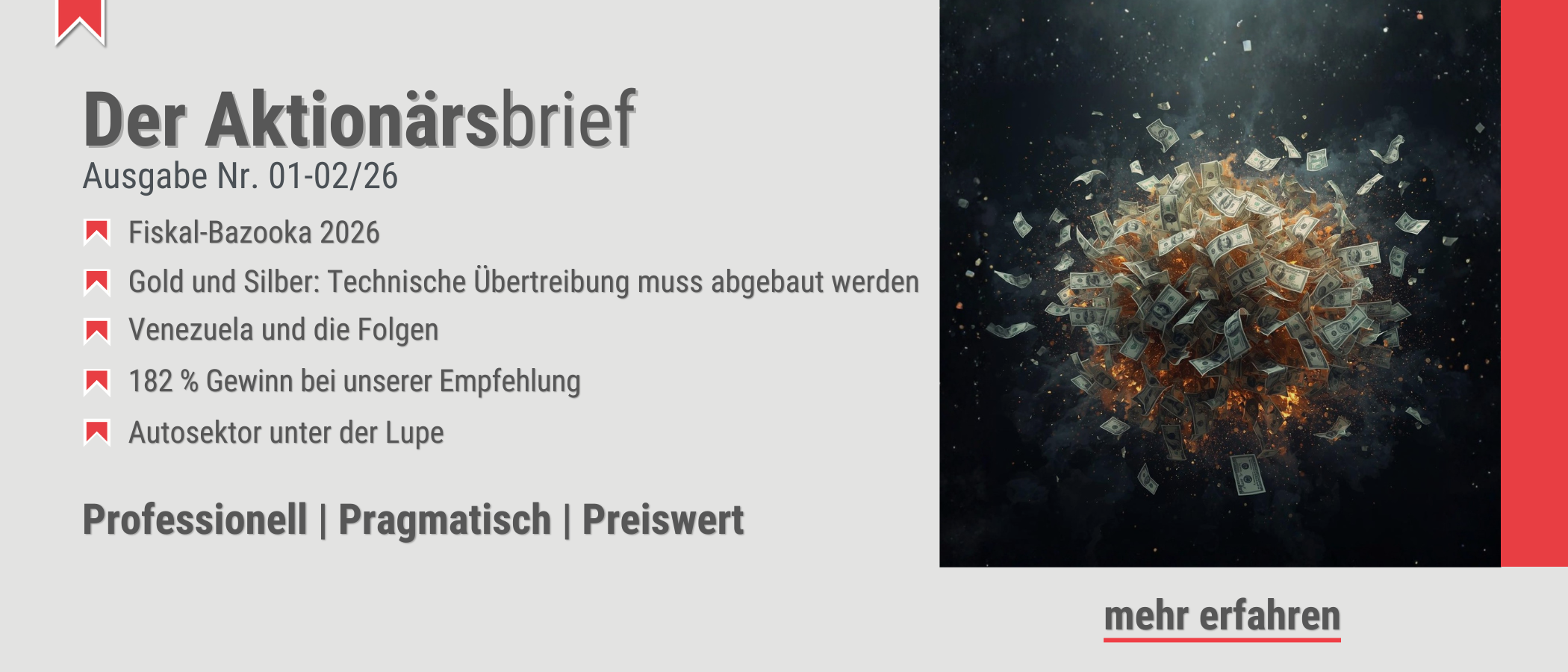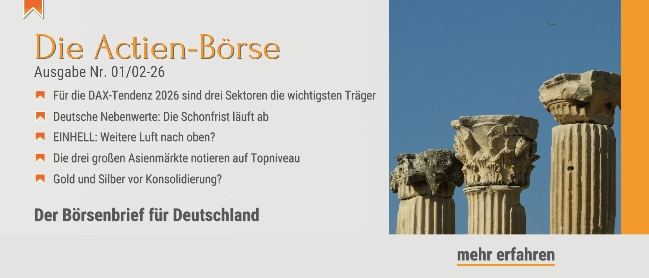 <p>Im Verarbeitenden Gewerbe Deutschlands gingen im November 2025 5,6 % mehr Neu-Bestellungen ein als im Oktober und 10,5 % mehr als im Vorjahresmonat. Das lässt sich sehen! Zwar sind die Zahlen momentan noch vorläufig, aber wenigstens etwas. Das Bild ändert sich sofort, wenn die Großaufträge herausgerechnet werden: Dann liegt das Monats-Plus bei 0,7 %. Im weniger volatilen Dreimonatsvergleich September bis November bleiben dann 4 % Zuwachs gegenüber denm drei Monaten zuvor übrig. Wie gesagt: Wenigstens etwas.</p> <p>Annerose Winkler</p> <p><a href="https://www.bernecker.info/unternehmer-brief">Der Deutsche Unternehmerbrief</a></p> <p><a href="https://www.bernecker.info">www.bernecker.info</a></p> <p><br />Publikationen der Hans A. Bernecker Börsenbriefe GmbH lesen Sie unter www.bernecker.info im Abo oder im Einzelabruf!</p>