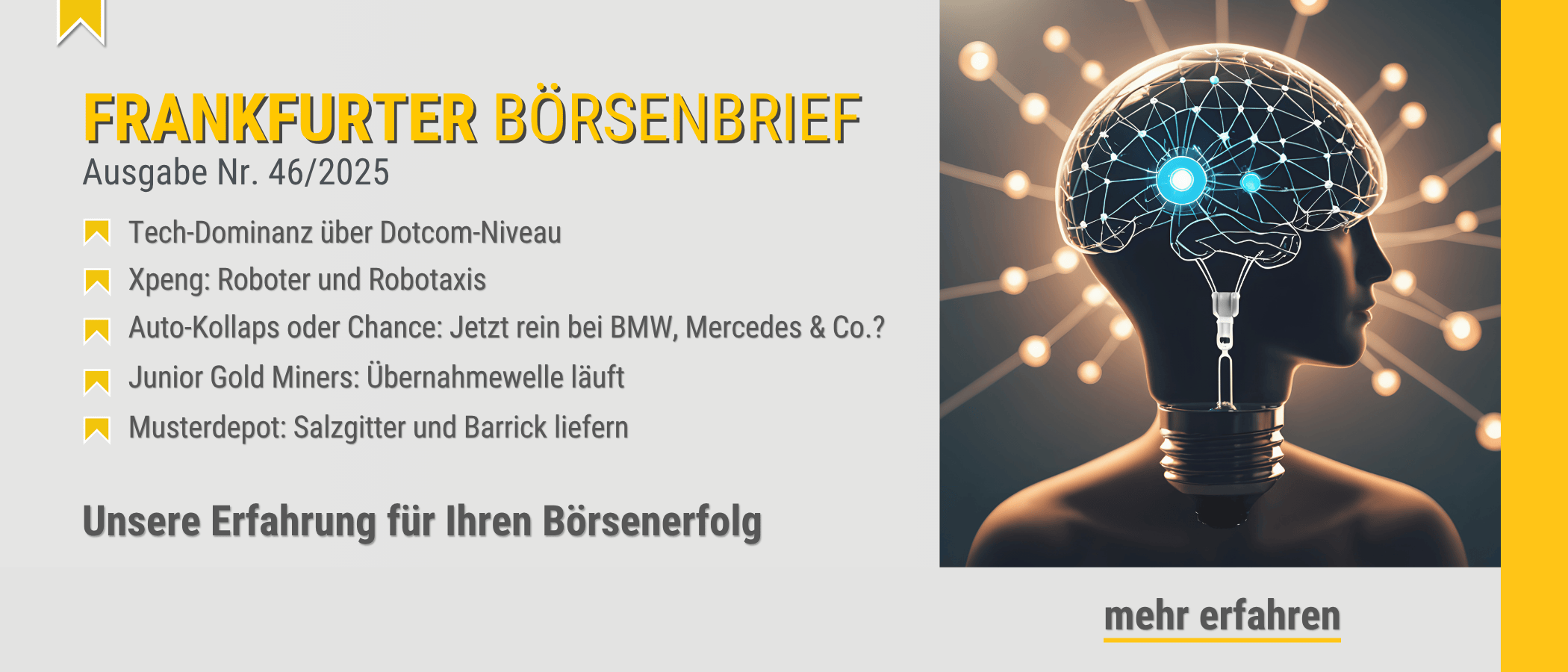 Es freut mich, Abonnent der Actien-Börse zu sein. Auch als Leser des Bernecker-Daily und des Aktionärsbriefs freue ich mich jede Woche aufs Neue. Kompetente und kompakte Analysen, Recherchen und Empfehlungen erster Güte begleiten meine Aktivitäten als Anleger wöchentlich seit vielen Jahren. Und dies zu meiner vollsten Zufriedenheit. Vielen herzlichen Dank.